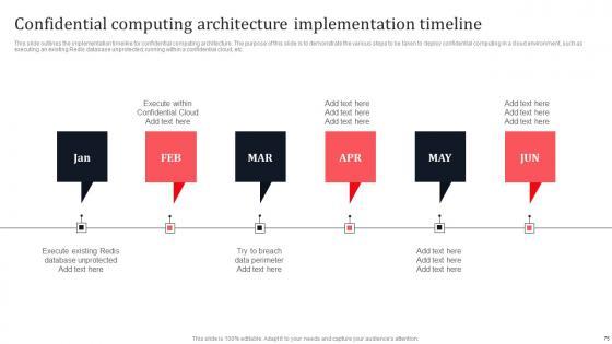 This slide outlines the implementation timeline for confidential computing architecture. The purpose of this slide is to demonstrate the various steps to be taken to deploy confidential computing in a cloud environment, such as executing an existing Redis database unprotected, running within a confidential cloud, etc. Find highly impressive Confidential Computing Architecture Implementation Timeline Secure Multi Party Demonstration Pdf on Slidegeeks to deliver a meaningful presentation. You can save an ample amount of time using these presentation templates. No need to worry to prepare everything from scratch because Slidegeeks experts have already done a huge research and work for you. You need to download Confidential Computing Architecture Implementation Timeline Secure Multi Party Demonstration Pdf for your upcoming presentation. All the presentation templates are 100 percent editable and you can change the color and personalize the content accordingly. Download now. This slide outlines the implementation timeline for confidential computing architecture. The purpose of this slide is to demonstrate the various steps to be taken to deploy confidential computing in a cloud environment, such as executing an existing Redis database unprotected, running within a confidential cloud, etc.