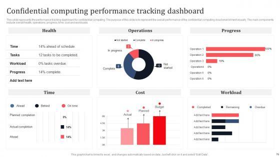 This slide represents the performance tracking dashboard for confidential computing. The purpose of this slide is to represent the overall performance of the confidential computing cloud environment visually. The main components include overall health, operations, progress, time, cost and workloads. Coming up with a presentation necessitates that the majority of the effort goes into the content and the message you intend to convey. The visuals of a PowerPoint presentation can only be effective if it supplements and supports the story that is being told. Keeping this in mind our experts created Confidential Computing Performance Tracking Dashboard Secure Multi Party Portrait Pdf to reduce the time that goes into designing the presentation. This way, you can concentrate on the message while our designers take care of providing you with the right template for the situation. This slide represents the performance tracking dashboard for confidential computing. The purpose of this slide is to represent the overall performance of the confidential computing cloud environment visually. The main components include overall health, operations, progress, time, cost and workloads.