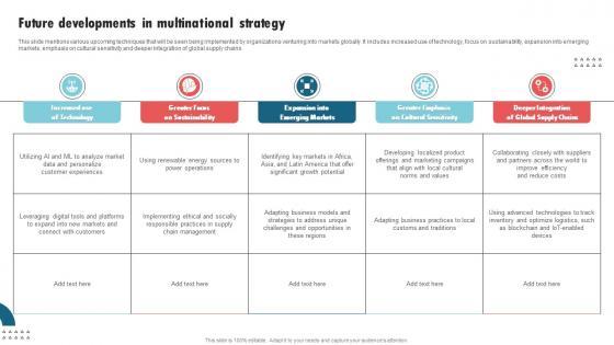 This slide mentions various upcoming techniques that will be seen being implemented by organizations venturing into markets globally. It includes increased use of technology, focus on sustainability, expansion into emerging markets, emphasis on cultural sensitivity and deeper integration of global supply chains.Present like a pro with Future Developments In Multinational Strategy International Strategy Corporations Formats Pdf Create beautiful presentations together with your team, using our easy-to-use presentation slides. Share your ideas in real-time and make changes on the fly by downloading our templates. So whether you are in the office, on the go, or in a remote location, you can stay in sync with your team and present your ideas with confidence. With Slidegeeks presentation got a whole lot easier. Grab these presentations today. This slide mentions various upcoming techniques that will be seen being implemented by organizations venturing into markets globally. It includes increased use of technology, focus on sustainability, expansion into emerging markets, emphasis on cultural sensitivity and deeper integration of global supply chains.