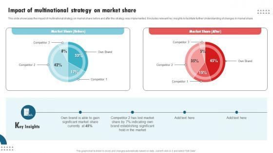 This slide showcases the impact of multinational strategy on market share before and after the strategy was implemented. It includes relevant key insights to facilitate further Understanding of changes in market share. Are you in need of a template that can accommodate all of your creative concepts This one is crafted professionally and can be altered to fit any style. Use it with Google Slides or PowerPoint. Include striking photographs, symbols, depictions, and other visuals. Fill, move around, or remove text boxes as desired. Test out color palettes and font mixtures. Edit and save your work, or work with colleagues. Download Impact Of Multinational Strategy On Market International Strategy Corporations Graphics Pdf and observe how to make your presentation outstanding. Give an impeccable presentation to your group and make your presentation unforgettable. This slide showcases the impact of multinational strategy on market share before and after the strategy was implemented. It includes relevant key insights to facilitate further Understanding of changes in market share.