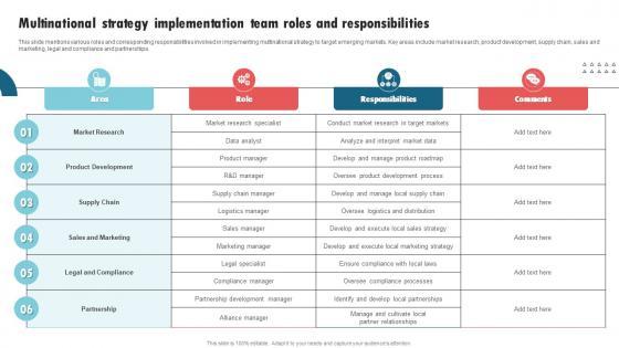 This slide mentions various roles and corresponding responsibilities involved in implementing multinational strategy to target emerging markets. Key areas include market research, product development, supply chain, sales and marketing, legal and compliance and partnerships. Retrieve professionally designed Multinational Strategy Implementation Team International Strategy Corporations Summary Pdf to effectively convey your message and captivate your listeners. Save time by selecting pre-made slideshows that are appropriate for various topics, from business to educational purposes. These themes come in many different styles, from creative to corporate, and all of them are easily adjustable and can be edited quickly. Access them as PowerPoint templates or as Google Slides themes. You do not have to go on a hunt for the perfect presentation because Slidegeeks got you covered from everywhere. This slide mentions various roles and corresponding responsibilities involved in implementing multinational strategy to target emerging markets. Key areas include market research, product development, supply chain, sales and marketing, legal and compliance and partnerships.