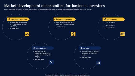 This slide highlights the detailed messages for investor which includes market opportunities, supplier choice, untapped potential and portfolio of our company. Explore a selection of the finest Market Development Opportunities Multinational Organization Customer Goods Ideas Pdf here. With a plethora of professionally designed and pre made slide templates, you can quickly and easily find the right one for your upcoming presentation. You can use our Market Development Opportunities Multinational Organization Customer Goods Ideas Pdf to effectively convey your message to a wider audience. Slidegeeks has done a lot of research before preparing these presentation templates. The content can be personalized and the slides are highly editable. Grab templates today from Slidegeeks. This slide highlights the detailed messages for investor which includes market opportunities, supplier choice, untapped potential and portfolio of our company.