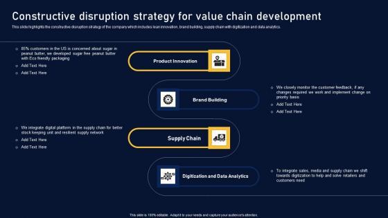 This slide highlights the constructive disruption strategy of the company which includes lean innovation, brand building, supply chain with digitization and data analytics. Formulating a presentation can take up a lot of effort and time, so the content and message should always be the primary focus. The visuals of the PowerPoint can enhance the presenters message, so our Constructive Disruption Strategy Multinational Organization Customer Goods Download Pdf was created to help save time. Instead of worrying about the design, the presenter can concentrate on the message while our designers work on creating the ideal templates for whatever situation is needed. Slidegeeks has experts for everything from amazing designs to valuable content, we have put everything into Constructive Disruption Strategy Multinational Organization Customer Goods Download Pdf This slide highlights the constructive disruption strategy of the company which includes lean innovation, brand building, supply chain with digitization and data analytics.