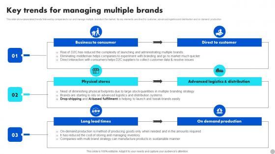 This slide showcases latest trends followed by companies to run and manage multiple brands in the market. Its key elements are direct to customer, advanced logistics and distribution and on demand production. The best PPT templates are a great way to save time, energy, and resources. Slidegeeks have 100 percent editable powerpoint slides making them incredibly versatile. With these quality presentation templates, you can create a captivating and memorable presentation by combining visually appealing slides and effectively communicating your message. Download Key Trends For Managing Multiple Brands Brand Diversification Approach Professional Pdf from Slidegeeks and deliver a wonderful presentation. This slide showcases latest trends followed by companies to run and manage multiple brands in the market. Its key elements are direct to customer, advanced logistics and distribution and on demand production.
