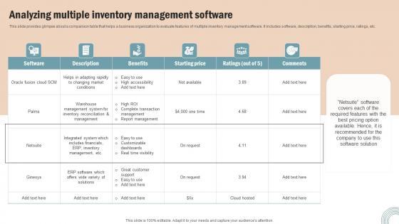This slide provides glimpse about a comparison table that helps a business organization to evaluate features of multiple inventory management software. It includes software, description, benefits, starting price, ratings, etc. Slidegeeks is one of the best resources for PowerPoint templates. You can download easily and regulate Analyzing Multiple Inventory Business Performance Optimization New Operations Strategy Ideas Pdf for your personal presentations from our wonderful collection. A few clicks is all it takes to discover and get the most relevant and appropriate templates. Use our Templates to add a unique zing and appeal to your presentation and meetings. All the slides are easy to edit and you can use them even for advertisement purposes. This slide provides glimpse about a comparison table that helps a business organization to evaluate features of multiple inventory management software. It includes software, description, benefits, starting price, ratings, etc.