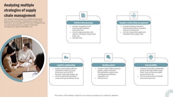 This slide provides glimpse about different strategies that can help a business organization in supply chain distribution and management. It includes strategies such as collaborative planning, supplier relationship management, logistics optimization, etc. Want to ace your presentation in front of a live audience Our Analyzing Multiple Strategies Business Performance Optimization New Operations Strategy Background Pdf can help you do that by engaging all the users towards you. Slidegeeks experts have put their efforts and expertise into creating these impeccable powerpoint presentations so that you can communicate your ideas clearly. Moreover, all the templates are customizable, and easy to edit and downloadable. Use these for both personal and commercial use. This slide provides glimpse about different strategies that can help a business organization in supply chain distribution and management. It includes strategies such as collaborative planning, supplier relationship management, logistics optimization, etc.