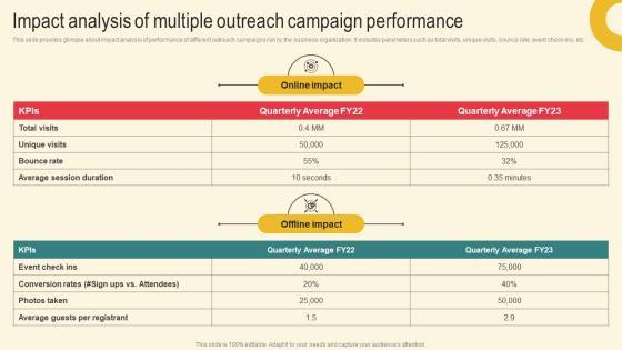 This slide provides glimpse about impact analysis of performance of different outreach campaigns ran by the business organization. It includes parameters such as total visits, unique visits, bounce rate, event check ins, etc. Find highly impressive Impact Analysis Multiple Outreach Marketing Plan For Boosting Client Retention In Retail Banking Icons Pdf on Slidegeeks to deliver a meaningful presentation. You can save an ample amount of time using these presentation templates. No need to worry to prepare everything from scratch because Slidegeeks experts have already done a huge research and work for you. You need to download Impact Analysis Multiple Outreach Marketing Plan For Boosting Client Retention In Retail Banking Icons Pdf for your upcoming presentation. All the presentation templates are 100 percent editable and you can change the color and personalize the content accordingly. Download now This slide provides glimpse about impact analysis of performance of different outreach campaigns ran by the business organization. It includes parameters such as total visits, unique visits, bounce rate, event check ins, etc.