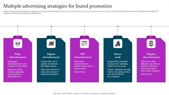 Mentioned slide provides insights into multiple types of advertisement strategies which can be used by advertisers to improve brand presence in market. It includes strategies print advertisement, digital advertisement, PPC advertisement, Direct mail and display advertisement Create an editable Multiple Advertising Strategies Marketing Mix Communication Guide Client Professional Pdf that communicates your idea and engages your audience. Whether you are presenting a business or an educational presentation, pre designed presentation templates help save time. Multiple Advertising Strategies Marketing Mix Communication Guide Client Professional Pdf is highly customizable and very easy to edit, covering many different styles from creative to business presentations. Slidegeeks has creative team members who have crafted amazing templates. So, go and get them without any delay. Mentioned slide provides insights into multiple types of advertisement strategies which can be used by advertisers to improve brand presence in market. It includes strategies print advertisement, digital advertisement, PPC advertisement, Direct mail and display advertisement