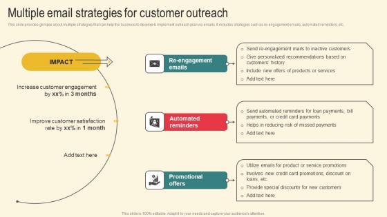 This slide provides glimpse about multiple strategies that can help the business to develop and implement outreach plan via emails. It includes strategies such as re engagement emails, automated reminders, etc. Coming up with a presentation necessitates that the majority of the effort goes into the content and the message you intend to convey. The visuals of a PowerPoint presentation can only be effective if it supplements and supports the story that is being told. Keeping this in mind our experts created Multiple Email Strategies Marketing Plan For Boosting Client Retention In Retail Banking Professional Pdf to reduce the time that goes into designing the presentation. This way, you can concentrate on the message while our designers take care of providing you with the right template for the situation. This slide provides glimpse about multiple strategies that can help the business to develop and implement outreach plan via emails. It includes strategies such as re engagement emails, automated reminders, etc.