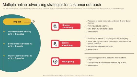 This slide provides glimpse about multiple strategies that can help the business to develop and implement outreach plan via online advertising. It includes strategies such as display advertising, search advertising, etc. Welcome to our selection of the Multiple Online Advertising Marketing Plan For Boosting Client Retention In Retail Banking Download Pdf. These are designed to help you showcase your creativity and bring your sphere to life. Planning and Innovation are essential for any business that is just starting out. This collection contains the designs that you need for your everyday presentations. All of our PowerPoints are 100 percent editable, so you can customize them to suit your needs. This multi purpose template can be used in various situations. Grab these presentation templates today This slide provides glimpse about multiple strategies that can help the business to develop and implement outreach plan via online advertising. It includes strategies such as display advertising, search advertising, etc.