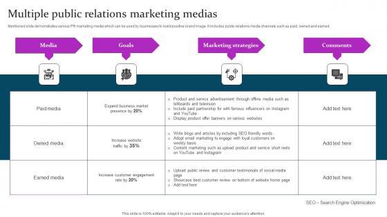 Mentioned slide demonstrates various PR marketing media which can be used by businesses to build positive brand image. It includes public relations media channels such as paid, owned and earned. Want to ace your presentation in front of a live audience Our Multiple Public Relations Marketing Medias Marketing Mix Communication Guide Client Template Pdf can help you do that by engaging all the users towards you. Slidegeeks experts have put their efforts and expertise into creating these impeccable powerpoint presentations so that you can communicate your ideas clearly. Moreover, all the templates are customizable, and easy to edit and downloadable. Use these for both personal and commercial use. Mentioned slide demonstrates various PR marketing media which can be used by businesses to build positive brand image. It includes public relations media channels such as paid, owned and earned.