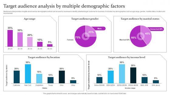 Mentioned slide provides insights about various demographics which can be used by business to identify potential target customer for business. It includes key demographics such as age range, gender, marital status, location and income level. Welcome to our selection of the Target Audience Analysis By Multiple Marketing Mix Communication Guide Client Pictures Pdf. These are designed to help you showcase your creativity and bring your sphere to life. Planning and Innovation are essential for any business that is just starting out. This collection contains the designs that you need for your everyday presentations. All of our PowerPoints are 100 percent editable, so you can customize them to suit your needs. This multi purpose template can be used in various situations. Grab these presentation templates today Mentioned slide provides insights about various demographics which can be used by business to identify potential target customer for business. It includes key demographics such as age range, gender, marital status, location and income level.