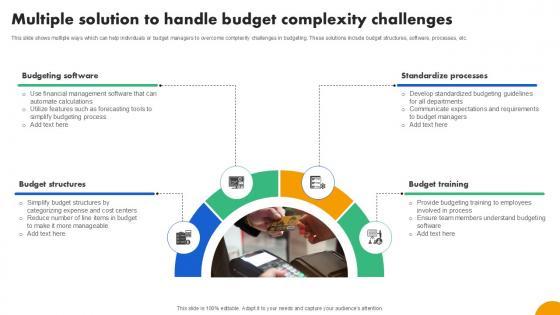 This slide shows multiple ways which can help individuals or budget managers to overcome complexity challenges in budgeting. These solutions include budget structures, software, processes, etc. Are you searching for a Multiple Solution To Handle Budget Complexity Effective And Efficient Tools To Develop Fin SS V that is uncluttered, straightforward, and original Its easy to edit, and you can change the colors to suit your personal or business branding. For a presentation that expresses how much effort you have put in, this template is ideal With all of its features, including tables, diagrams, statistics, and lists, its perfect for a business plan presentation. Make your ideas more appealing with these professional slides. Download Multiple Solution To Handle Budget Complexity Effective And Efficient Tools To Develop Fin SS V from Slidegeeks today. This slide shows multiple ways which can help individuals or budget managers to overcome complexity challenges in budgeting. These solutions include budget structures, software, processes, etc.