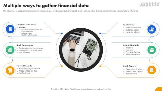 This slide shows various types of financial statements which can be used by individuals or budget managers to collect past financial data. It includes income statements, balance sheets, tax returns, etc. Retrieve professionally designed Multiple Ways To Gather Financial Data Effective And Efficient Tools To Develop Fin SS V to effectively convey your message and captivate your listeners. Save time by selecting pre-made slideshows that are appropriate for various topics, from business to educational purposes. These themes come in many different styles, from creative to corporate, and all of them are easily adjustable and can be edited quickly. Access them as PowerPoint templates or as Google Slides themes. You do not have to go on a hunt for the perfect presentation because Slidegeeks got you covered from everywhere. This slide shows various types of financial statements which can be used by individuals or budget managers to collect past financial data. It includes income statements, balance sheets, tax returns, etc.