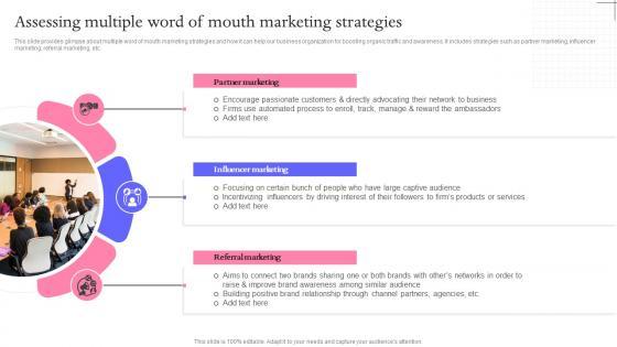 This slide provides glimpse about multiple word of mouth marketing strategies and how it can help our business organization for boosting organic traffic and awareness. It includes strategies such as partner marketing, influencer marketing, referral marketing, etc. Boost your pitch with our creative Assessing Multiple Word Of Buzz Marketing Techniques For Engaging Portrait Pdf. Deliver an awe inspiring pitch that will mesmerize everyone. Using these presentation templates you will surely catch everyones attention. You can browse the ppts collection on our website. We have researchers who are experts at creating the right content for the templates. So you do not have to invest time in any additional work. Just grab the template now and use them. This slide provides glimpse about multiple word of mouth marketing strategies and how it can help our business organization for boosting organic traffic and awareness. It includes strategies such as partner marketing, influencer marketing, referral marketing, etc.