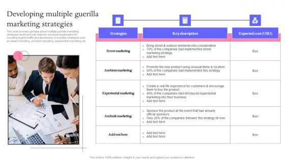 This slide provides glimpse about multiple guerilla marketing strategies and how it can help our business organization for boosting organic traffic and awareness. It includes strategies such as street marketing, ambient marketing, experiential marketing, etc. There are so many reasons you need a Developing Multiple Guerilla Buzz Marketing Techniques For Engaging Diagrams Pdf. The first reason is you can not spend time making everything from scratch, Thus, Slidegeeks has made presentation templates for you too. You can easily download these templates from our website easily. This slide provides glimpse about multiple guerilla marketing strategies and how it can help our business organization for boosting organic traffic and awareness. It includes strategies such as street marketing, ambient marketing, experiential marketing, etc.