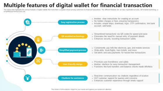 The below slide highlights the various features of digital wallets that make them a popular choice among customers for financial transactions. The different features are an easy registration process, QR-enabled technology, a simplified payment process, etc. Do you have to make sure that everyone on your team knows about any specific topic I yes, then you should give Multiple Features Of Digital Wallet For Financial In Depth Guide To Digital Wallets Fin SS V a try. Our experts have put a lot of knowledge and effort into creating this impeccable Multiple Features Of Digital Wallet For Financial In Depth Guide To Digital Wallets Fin SS V. You can use this template for your upcoming presentations, as the slides are perfect to represent even the tiniest detail. You can download these templates from the Slidegeeks website and these are easy to edit. So grab these today The below slide highlights the various features of digital wallets that make them a popular choice among customers for financial transactions. The different features are an easy registration process, QR-enabled technology, a simplified payment process, etc.