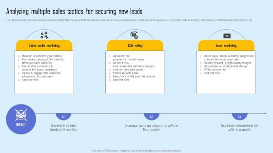 This slide provides glimpse about employing different techniques that can help the business in new lead generation. It includes techniques such as social media marketing, cold calling, email marketing, their impact, etc. Crafting an eye catching presentation has never been more straightforward. Let your presentation shine with this tasteful yet straightforward Effective Sales Strategy To Enhance Customer Retention Analyzing Multiple Sales Formats Pdf template. It offers a minimalistic and classy look that is great for making a statement. The colors have been employed intelligently to add a bit of playfulness while still remaining professional. Construct the ideal Effective Sales Strategy To Enhance Customer Retention Analyzing Multiple Sales Formats Pdf that effortlessly grabs the attention of your audience Begin now and be certain to wow your customers This slide provides glimpse about employing different techniques that can help the business in new lead generation. It includes techniques such as social media marketing, cold calling, email marketing, their impact, etc.
