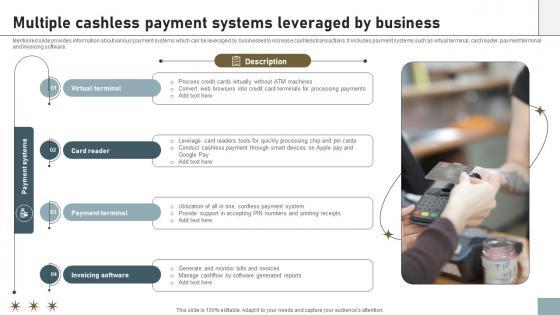 Mentioned slide provides information about various payment systems which can be leveraged by businesses to increase cashless transactions. It includes payment systems such as virtual terminal, card reader, payment terminal and invoicing software. Are you in need of a template that can accommodate all of your creative concepts This one is crafted professionally and can be altered to fit any style. Use it with Google Slides or PowerPoint. Include striking photographs, symbols, depictions, and other visuals. Fill, move around, or remove text boxes as desired. Test out color palettes and font mixtures. Edit and save your work, or work with colleagues. Download Online Payment Techniques Multiple Cashless Payment Systems Leveraged and observe how to make your presentation outstanding. Give an impeccable presentation to your group and make your presentation unforgettable. Mentioned slide provides information about various payment systems which can be leveraged by businesses to increase cashless transactions. It includes payment systems such as virtual terminal, card reader, payment terminal and invoicing software.