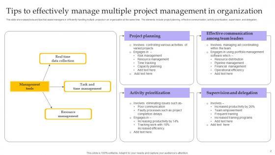This slide showcases tools and tips that assist managers in efficiently handling multiple projects in an organization at the same time. The elements include project planning, effective communication, activity prioritization, supervision, and delegation. Pitch your topic with ease and precision using this Tips To Effectively Manage Multiple Project Management In Organization Summary Pdf. This layout presents information on Project Planning, Activity Prioritization, Supervision And Delegation, Real Time Data Collection. It is also available for immediate download and adjustment. So, changes can be made in the color, design, graphics or any other component to create a unique layout. This slide showcases tools and tips that assist managers in efficiently handling multiple projects in an organization at the same time. The elements include project planning, effective communication, activity prioritization, supervision, and delegation.