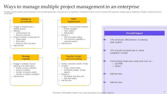 This slide depicts the methods chosen by managers for the controlled implementation of a project plan in an organization. The elements include an overview of projects, PMO employment, strategic capacity, simplification of budgets, cost tracking, and their overall impact. Showcasing this set of slides titled Ways To Manage Multiple Project Management In An Enterprise Designs Pdf. The topics addressed in these templates are Manage Multiple Project, Management In An Enterprise, Simplification Of Budgets, Cost Tracking. All the content presented in this PPT design is completely editable. Download it and make adjustments in color, background, font etc. as per your unique business setting. This slide depicts the methods chosen by managers for the controlled implementation of a project plan in an organization. The elements include an overview of projects, PMO employment, strategic capacity, simplification of budgets, cost tracking, and their overall impact.