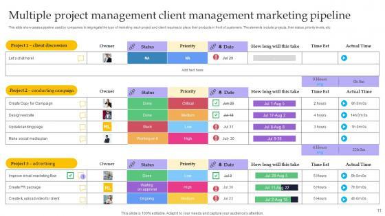 Share a great deal of information on the topic by deploying this Multiple Project Management Ppt Powerpoint Presentation Complete Deck With Slides. Support your ideas and thought process with this prefabricated set. It includes a set of fifteen slides, all fully modifiable and editable. Each slide can be restructured and induced with the information and content of your choice. You can add or remove large content boxes as well, to make this PPT slideshow more personalized. Its high-quality graphics and visuals help in presenting a well-coordinated pitch. This PPT template is also a resourceful tool to take visual cues from and implement the best ideas to help your business grow and expand. The main attraction of this well-formulated deck is that everything is editable, giving you the freedom to adjust it to your liking and choice. Changes can be made in the background and theme as well to deliver an outstanding pitch. Therefore, click on the download button now to gain full access to this multifunctional set. Our Multiple Project Management Ppt Powerpoint Presentation Complete Deck With Slides are topically designed to provide an attractive backdrop to any subject. Use them to look like a presentation pro.