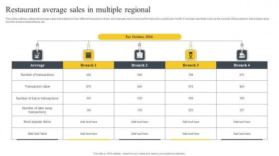 This slide outlines restaurant average sales transactions in four different branches to track and evaluate each branch performance for a particular month. It includes elements such as the number of transactions, transaction value, number of eat-in transactions, etc. Showcasing this set of slides titled Restaurant Average Sales In Multiple Regional Download Pdf. The topics addressed in these templates are Restaurant Average Sales, Multiple Regional. All the content presented in this PPT design is completely editable. Download it and make adjustments in color, background, font etc. as per your unique business setting. This slide outlines restaurant average sales transactions in four different branches to track and evaluate each branch performance for a particular month. It includes elements such as the number of transactions, transaction value, number of eat-in transactions, etc.