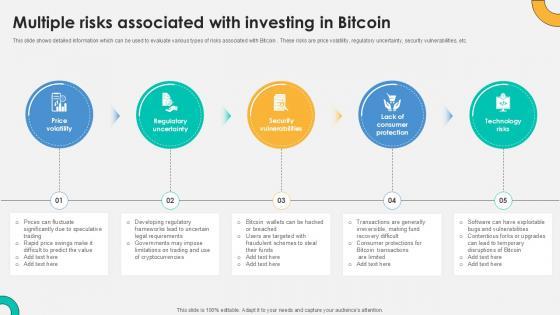 This slide shows detailed information which can be used to evaluate various types of risks associated with Bitcoin . These risks are price volatility, regulatory uncertainty, security vulnerabilities, etc. Crafting an eye-catching presentation has never been more straightforward. Let your presentation shine with this tasteful yet straightforward Multiple Risks Associated With Everything About Bitcoin PPT PowerPoint Fin SS V template. It offers a minimalistic and classy look that is great for making a statement. The colors have been employed intelligently to add a bit of playfulness while still remaining professional. Construct the ideal Multiple Risks Associated With Everything About Bitcoin PPT PowerPoint Fin SS V that effortlessly grabs the attention of your audience Begin now and be certain to wow your customers This slide shows detailed information which can be used to evaluate various types of risks associated with Bitcoin . These risks are price volatility, regulatory uncertainty, security vulnerabilities, etc.