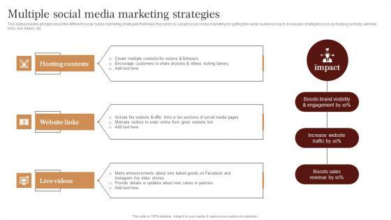 This slide provides glimpse about the different social media marketing strategies that helps the bakery to adopt social media marketing for getting the wider audience reach. It includes strategies such as hosting contests, website links, live videos, etc. Find highly impressive Digital Advertising Plan For Bakery Business Multiple Social Media Marketing Strategies Portrait PDF on Slidegeeks to deliver a meaningful presentation. You can save an ample amount of time using these presentation templates. No need to worry to prepare everything from scratch because Slidegeeks experts have already done a huge research and work for you. You need to download Digital Advertising Plan For Bakery Business Multiple Social Media Marketing Strategies Portrait PDF for your upcoming presentation. All the presentation templates are 100 percent editable and you can change the color and personalize the content accordingly. Download now.