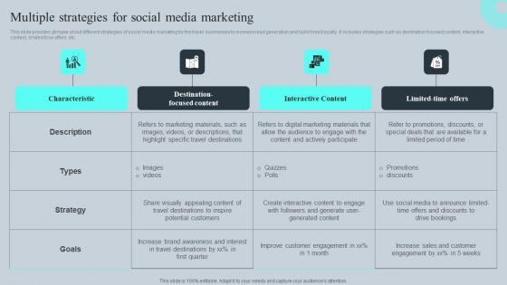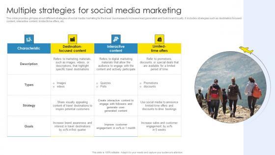 This slide provides glimpse about different strategies of social media marketing for the travel businesses to increase lead generation and build brand loyalty. It includes strategies such as destination focused content, interactive content, limited time offers, etc. Get a simple yet stunning designed Tour And Travel Agency Marketing Multiple Strategies For Social Media Marketing Designs PDF. It is the best one to establish the tone in your meetings. It is an excellent way to make your presentations highly effective. So, download this PPT today from Slidegeeks and see the positive impacts. Our easy-to-edit Tour And Travel Agency Marketing Multiple Strategies For Social Media Marketing Designs PDF can be your go-to option for all upcoming conferences and meetings. So, what are you waiting for Grab this template today.