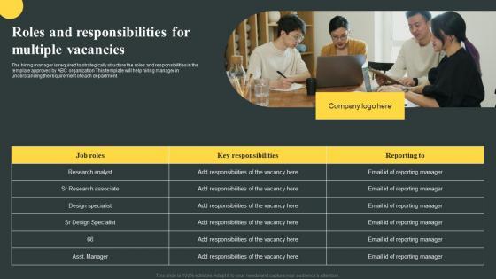 The hiring manager is required to strategically structure the roles and responsibilities in the template approved by ABC organization This template will help hiring manager in understanding the requirement of each department. Do you know about Slidesgeeks Roles And Responsibilities For Multiple Vacancies Organizations Guide To Talent Topics Pdf These are perfect for delivering any kind od presentation. Using it, create PowerPoint presentations that communicate your ideas and engage audiences. Save time and effort by using our pre-designed presentation templates that are perfect for a wide range of topic. Our vast selection of designs covers a range of styles, from creative to business, and are all highly customizable and easy to edit. Download as a PowerPoint template or use them as Google Slides themes. The hiring manager is required to strategically structure the roles and responsibilities in the template approved by ABC organization This template will help hiring manager in understanding the requirement of each department.
