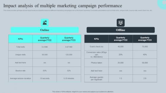 This slide provides glimpse about impact analysis of performance of different marketing campaigns ran by the travel business. It includes parameters such as total visits, unique visits, bounce rate, event check-ins, etc. Are you in need of a template that can accommodate all of your creative concepts This one is crafted professionally and can be altered to fit any style. Use it with Google Slides or PowerPoint. Include striking photographs, symbols, depictions, and other visuals. Fill, move around, or remove text boxes as desired. Test out color palettes and font mixtures. Edit and save your work, or work with colleagues. Download Impact Analysis Of Multiple Marketing Tours And Travel Business Advertising Sample Pdf and observe how to make your presentation outstanding. Give an impeccable presentation to your group and make your presentation unforgettable. This slide provides glimpse about impact analysis of performance of different marketing campaigns ran by the travel business. It includes parameters such as total visits, unique visits, bounce rate, event check-ins, etc.