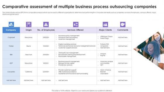 This slide includes various BPO firms comparative analysis which can be used by different organization to determine best performing firm. It includes elements such as companies, number of employees, services offered, major clients and global reach. Pitch your topic with ease and precision using this Comparative Assessment Of Multiple Business Process Outsourcing Companies Rules Pdf. This layout presents information on Company, Employees, Services Offered. It is also available for immediate download and adjustment. So, changes can be made in the color, design, graphics or any other component to create a unique layout. This slide includes various BPO firms comparative analysis which can be used by different organization to determine best performing firm. It includes elements such as companies, number of employees, services offered, major clients and global reach.