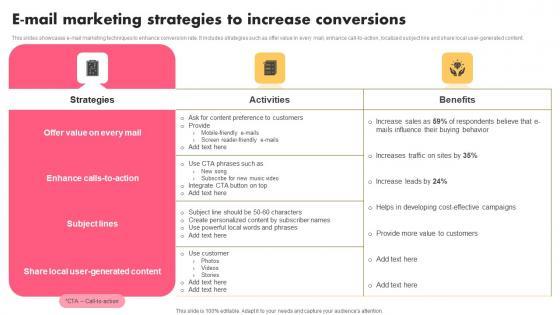 This slides showcases e mail marketing techniques to enhance conversion rate. It includes strategies such as offer value in every mail, enhance call to action, localized subject line and share local user generated content. Present like a pro with E Mail Marketing Strategies Music Industry Marketing Plan To Enhance Brand Image Introduction Pdf Create beautiful presentations together with your team, using our easy to use presentation slides. Share your ideas in real time and make changes on the fly by downloading our templates. So whether you are in the office, on the go, or in a remote location, you can stay in sync with your team and present your ideas with confidence. With Slidegeeks presentation got a whole lot easier. Grab these presentations today. This slides showcases e mail marketing techniques to enhance conversion rate. It includes strategies such as offer value in every mail, enhance call to action, localized subject line and share local user generated content.