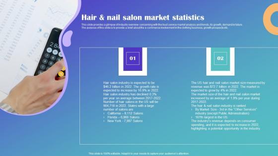 This slide provides a glimpse of industry overview concerning with the trust service market analysis and trends, its growth, demand in future. The purpose of this slide is to provide a brief about the e-commerce involvement in the clothing business, growth prospects etc. There are so many reasons you need a Hair And Nail Salon Market Statistics Drop Shipping Business Plan Topics Pdf The first reason is you can not spend time making everything from scratch, Thus, Slidegeeks has made presentation templates for you too. You can easily download these templates from our website easily. This slide provides a glimpse of industry overview concerning with the trust service market analysis and trends, its growth, demand in future. The purpose of this slide is to provide a brief about the e-commerce involvement in the clothing business, growth prospects etc.