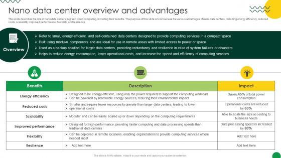 This slide describes the role of nano data centers in green cloud computing, including their benefits. The purpose of this slide is to showcase the various advantages of nano data centers, including energy efficiency, reduced costs, scalability, improved performance, flexibility, and resilience. From laying roadmaps to briefing everything in detail, our templates are perfect for you. You can set the stage with your presentation slides. All you have to do is download these easy-to-edit and customizable templates. Sustainable Nano Data Center Overview And Advantages will help you deliver an outstanding performance that everyone would remember and praise you for. Do download this presentation today. This slide describes the role of nano data centers in green cloud computing, including their benefits. The purpose of this slide is to showcase the various advantages of nano data centers, including energy efficiency, reduced costs, scalability, improved performance, flexibility, and resilience.