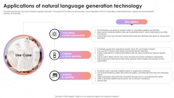 This slide describes the use cases of Natural Language Generation. The purpose of this slide is to showcase the various applications of NLG in automating content requirements, chatbots and virtual assistants, analytics, and reporting. Slidegeeks is one of the best resources for PowerPoint templates. You can download easily and regulate Applications Of Natural Language Generation Technology AI Content Creation It Ppt Template for your personal presentations from our wonderful collection. A few clicks is all it takes to discover and get the most relevant and appropriate templates. Use our Templates to add a unique zing and appeal to your presentation and meetings. All the slides are easy to edit and you can use them even for advertisement purposes. This slide describes the use cases of Natural Language Generation. The purpose of this slide is to showcase the various applications of NLG in automating content requirements, chatbots and virtual assistants, analytics, and reporting.