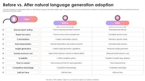 This slide represents an organizations before vs. after Natural Language Generation adoption state. The purpose of this slide is to showcase the comparison of various tasks that humans were performing manually and are now performed by the NLG system. There are so many reasons you need a Before Vs After Natural Language Generation Adoption AI Content Creation It Ppt Example The first reason is you can not spend time making everything from scratch, Thus, Slidegeeks has made presentation templates for you too. You can easily download these templates from our website easily. This slide represents an organizations before vs. after Natural Language Generation adoption state. The purpose of this slide is to showcase the comparison of various tasks that humans were performing manually and are now performed by the NLG system.