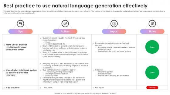 This slide describes the essential steps organizations should take while using Natural Language Generation more efficiently. The purpose of this slide is to showcase the best practices that can help businesses to serve clients in a better way and transform business internally. Do you have to make sure that everyone on your team knows about any specific topic I yes, then you should give Best Practice To Use Natural Language Generation Effectively AI Content Creation It Ppt Template a try. Our experts have put a lot of knowledge and effort into creating this impeccable Best Practice To Use Natural Language Generation Effectively AI Content Creation It Ppt Template You can use this template for your upcoming presentations, as the slides are perfect to represent even the tiniest detail. You can download these templates from the Slidegeeks website and these are easy to edit. So grab these today This slide describes the essential steps organizations should take while using Natural Language Generation more efficiently. The purpose of this slide is to showcase the best practices that can help businesses to serve clients in a better way and transform business internally.