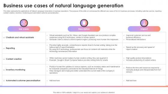 This slide represents the applications of Natural Language Generation in business operations. The purpose of this slide is to showcase the different use cases of NLG in business processes, including customer service, reporting, content creation, inventory monitoring and automated customer personalization. Do you have an important presentation coming up Are you looking for something that will make your presentation stand out from the rest Look no further than Business Use Cases Of Natural Language Generation AI Content Creation It Ppt Powerpoint With our professional designs, you can trust that your presentation will pop and make delivering it a smooth process. And with Slidegeeks, you can trust that your presentation will be unique and memorable. So why wait Grab Business Use Cases Of Natural Language Generation AI Content Creation It Ppt Powerpoint today and make your presentation stand out from the rest This slide represents the applications of Natural Language Generation in business operations. The purpose of this slide is to showcase the different use cases of NLG in business processes, including customer service, reporting, content creation, inventory monitoring and automated customer personalization.