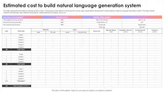 This slide represents the timeline to develop an NLG system. The purpose of this slide is to showcase the various steps organizations should perform while building a Natural Language Generation system. The steps include research and planning, data collection and analysis, model selection and training, and so on. Make sure to capture your audiences attention in your business displays with our gratis customizable Estimated Cost To Build Natural Language Generation System AI Content Creation It Ppt Powerpoint These are great for business strategies, office conferences, capital raising or task suggestions. If you desire to acquire more customers for your tech business and ensure they stay satisfied, create your own sales presentation with these plain slides. This slide represents the timeline to develop an NLG system. The purpose of this slide is to showcase the various steps organizations should perform while building a Natural Language Generation system. The steps include research and planning, data collection and analysis, model selection and training, and so on.
