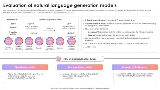 This slide illustrates how Natural Language Generation models are assessed. The purpose of this slide is to showcase the various methods and parameters to evaluate NLG models, including black box evaluation, glass box evaluation, accuracy, fluency, word-based metrics, grammar-based metrics, and semantic similarity metrics. Formulating a presentation can take up a lot of effort and time, so the content and message should always be the primary focus. The visuals of the PowerPoint can enhance the presenters message, so our Evaluation Of Natural Language Generation Models AI Content Creation It Ppt Slide was created to help save time. Instead of worrying about the design, the presenter can concentrate on the message while our designers work on creating the ideal templates for whatever situation is needed. Slidegeeks has experts for everything from amazing designs to valuable content, we have put everything into Evaluation Of Natural Language Generation Models AI Content Creation It Ppt Slide This slide illustrates how Natural Language Generation models are assessed. The purpose of this slide is to showcase the various methods and parameters to evaluate NLG models, including black box evaluation, glass box evaluation, accuracy, fluency, word-based metrics, grammar-based metrics, and semantic similarity metrics.