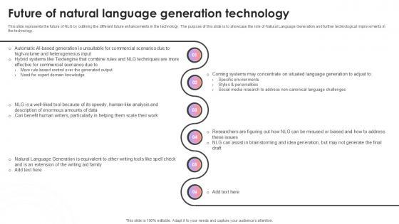 This slide represents the future of NLG by outlining the different future enhancements in the technology. The purpose of this slide is to showcase the role of Natural Language Generation and further technological improvements in the technology. This modern and well-arranged Future Of Natural Language Generation Technology AI Content Creation It Ppt Presentation provides lots of creative possibilities. It is very simple to customize and edit with the Powerpoint Software. Just drag and drop your pictures into the shapes. All facets of this template can be edited with Powerpoint, no extra software is necessary. Add your own material, put your images in the places assigned for them, adjust the colors, and then you can show your slides to the world, with an animated slide included. This slide represents the future of NLG by outlining the different future enhancements in the technology. The purpose of this slide is to showcase the role of Natural Language Generation and further technological improvements in the technology.