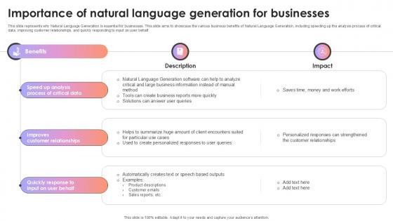 This slide represents why Natural Language Generation is essential for businesses. This slide aims to showcase the various business benefits of Natural Language Generation, including speeding up the analysis process of critical data, improving customer relationships, and quickly responding to input on user behalf Explore a selection of the finest Importance Of Natural Language Generation For Businesses AI Content Creation It Ppt Presentation here. With a plethora of professionally designed and pre-made slide templates, you can quickly and easily find the right one for your upcoming presentation. You can use our Importance Of Natural Language Generation For Businesses AI Content Creation It Ppt Presentation to effectively convey your message to a wider audience. Slidegeeks has done a lot of research before preparing these presentation templates. The content can be personalized and the slides are highly editable. Grab templates today from Slidegeeks. This slide represents why Natural Language Generation is essential for businesses. This slide aims to showcase the various business benefits of Natural Language Generation, including speeding up the analysis process of critical data, improving customer relationships, and quickly responding to input on user behalf