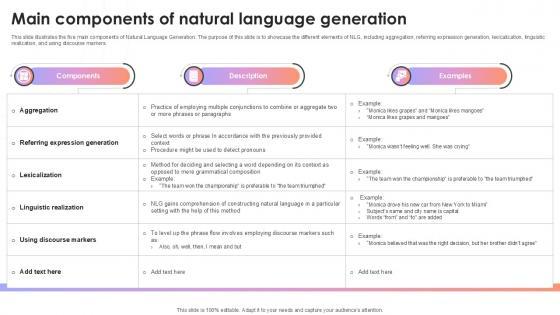 This slide illustrates the five main components of Natural Language Generation. The purpose of this slide is to showcase the different elements of NLG, including aggregation, referring expression generation, lexicalization, linguistic realization, and using discourse markers. Slidegeeks has constructed Main Components Of Natural Language Generation AI Content Creation It Ppt Powerpoint after conducting extensive research and examination. These presentation templates are constantly being generated and modified based on user preferences and critiques from editors. Here, you will find the most attractive templates for a range of purposes while taking into account ratings and remarks from users regarding the content. This is an excellent jumping-off point to explore our content and will give new users an insight into our top-notch PowerPoint Templates. This slide illustrates the five main components of Natural Language Generation. The purpose of this slide is to showcase the different elements of NLG, including aggregation, referring expression generation, lexicalization, linguistic realization, and using discourse markers.