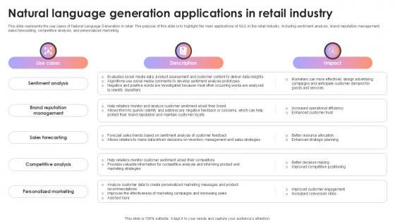This slide represents the use cases of Natural Language Generation in retail. The purpose of this slide is to highlight the main applications of NLG in the retail industry, including sentiment analysis, brand reputation management, sales forecasting, competitive analysis, and personalized marketing. Do you know about Slidesgeeks Natural Language Generation Applications In Retail Industry AI Content Creation It Ppt Example These are perfect for delivering any kind od presentation. Using it, create PowerPoint presentations that communicate your ideas and engage audiences. Save time and effort by using our pre-designed presentation templates that are perfect for a wide range of topic. Our vast selection of designs covers a range of styles, from creative to business, and are all highly customizable and easy to edit. Download as a PowerPoint template or use them as Google Slides themes. This slide represents the use cases of Natural Language Generation in retail. The purpose of this slide is to highlight the main applications of NLG in the retail industry, including sentiment analysis, brand reputation management, sales forecasting, competitive analysis, and personalized marketing.