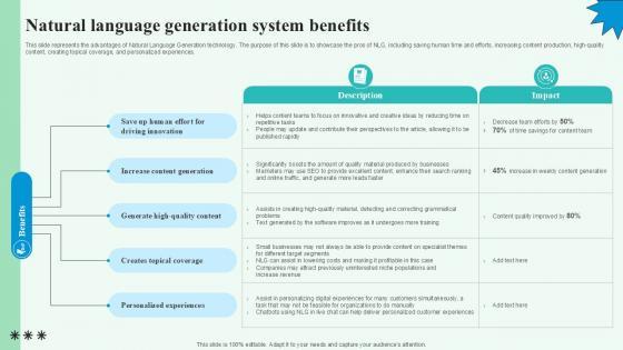 This slide represents the advantages of Natural Language Generation technology. The purpose of this slide is to showcase the pros of NLG, including saving human time and efforts, increasing content production, high-quality content, creating topical coverage, and personalized experiences. Create an editable Natural Language Generation System Benefits PPT Sample that communicates your idea and engages your audience. Whether you are presenting a business or an educational presentation, pre-designed presentation templates help save time. Natural Language Generation System Benefits PPT Sample is highly customizable and very easy to edit, covering many different styles from creative to business presentations. Slidegeeks has creative team members who have crafted amazing templates. So, go and get them without any delay. This slide represents the advantages of Natural Language Generation technology. The purpose of this slide is to showcase the pros of NLG, including saving human time and efforts, increasing content production, high-quality content, creating topical coverage, and personalized experiences.