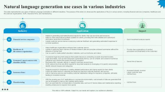 This slide represents the use cases of Natural Language Generation in different industries. The purpose of this slide is to showcase the applications of NLG in various sectors, including financial services companies, healthcare and life sciences organizations, SCRI, insurance firms, and manufacturing. Want to ace your presentation in front of a live audience Our Natural Language Generation Use Cases In Various Industries AI Content Creation It Ppt Template can help you do that by engaging all the users towards you. Slidegeeks experts have put their efforts and expertise into creating these impeccable powerpoint presentations so that you can communicate your ideas clearly. Moreover, all the templates are customizable, and easy-to-edit and downloadable. Use these for both personal and commercial use. This slide represents the use cases of Natural Language Generation in different industries. The purpose of this slide is to showcase the applications of NLG in various sectors, including financial services companies, healthcare and life sciences organizations, SCRI, insurance firms, and manufacturing.