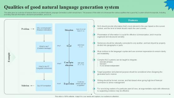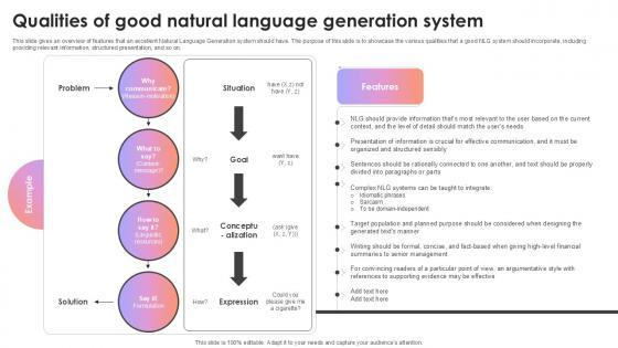 This slide gives an overview of features that an excellent Natural Language Generation system should have. The purpose of this slide is to showcase the various qualities that a good NLG system should incorporate, including providing relevant information, structured presentation, and so on. From laying roadmaps to briefing everything in detail, our templates are perfect for you. You can set the stage with your presentation slides. All you have to do is download these easy-to-edit and customizable templates. Qualities Of Good Natural Language Generation System AI Content Creation It Ppt Slide will help you deliver an outstanding performance that everyone would remember and praise you for. Do download this presentation today. This slide gives an overview of features that an excellent Natural Language Generation system should have. The purpose of this slide is to showcase the various qualities that a good NLG system should incorporate, including providing relevant information, structured presentation, and so on.