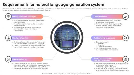 This slide represents the different needs of a Natural Language Generation system. The purpose of this slide is to showcase the various requirements for the NLG system, including primary data to be conveyed, the structure of content, the flow of sentences, choice of words, right referring expressions, and so on. Slidegeeks is here to make your presentations a breeze with Requirements For Natural Language Generation System AI Content Creation It Ppt Template With our easy-to-use and customizable templates, you can focus on delivering your ideas rather than worrying about formatting. With a variety of designs to choose from, you are sure to find one that suits your needs. And with animations and unique photos, illustrations, and fonts, you can make your presentation pop. So whether you are giving a sales pitch or presenting to the board, make sure to check out Slidegeeks first This slide represents the different needs of a Natural Language Generation system. The purpose of this slide is to showcase the various requirements for the NLG system, including primary data to be conveyed, the structure of content, the flow of sentences, choice of words, right referring expressions, and so on.
